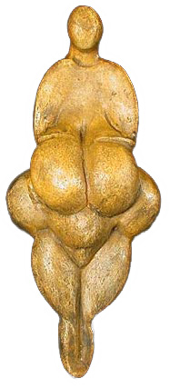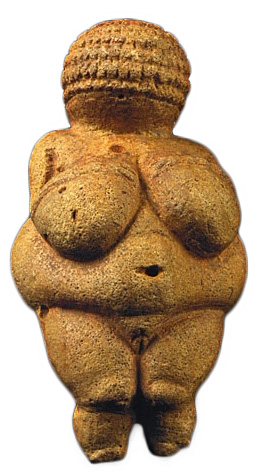 La famosa Venus de Willendorf (Klein, 2001; Seshadri, 2012), datada en los 22.000 años a.C, se encontró cerca del río Danubio (Austria), posando sus brazos sobre dos grandes pechos, cuyo largo alcanza su ombligo, ubicado en el centro de una panza grande y redonda que toma mayor volumen hacia sus costados, bajo la que también encontramos una hinchada y sobresaliente vulva; por el reverso posee un gran trasero, redondo y alto, iniciándose desde su marcada voluptuosidad entre dos gruesas piernas, con rodillas redondas de la grasa acumulada, que finalmente dan lugar a unas cortas antepiernas.