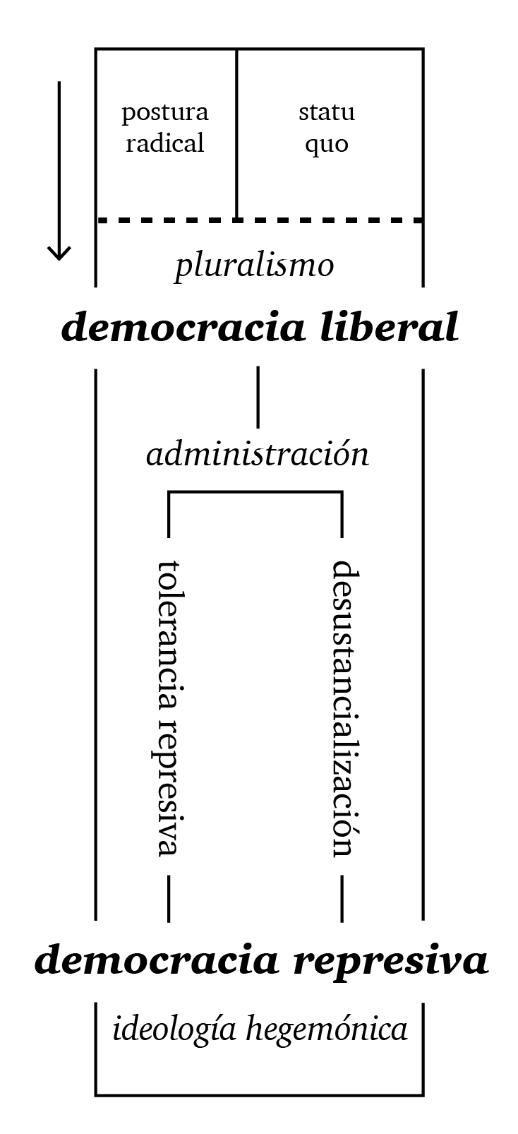 Tal como manifiestan las palabras previas de la Critique of Pure Tolerance (Wolff, Moore, y Marcuse 1965:viii), “la tolerancia, al examinarla, resultó ser –en niveles variables– máscaras hipócritas para cubrir pésimas realidades políticas”. El aspecto negativo al que se refieren Marcuse et al. es la tolerancia represiva como mecanismo para la excusa y defensa de la democracia. La convivencia entre posturas diferentes que exige el pluralismo se transforma necesariamente en un valor en sí para la democracia (Wolff 1965:14–15), en vista de que su necesidad resulta incuestionable y primigenia en tanto legitimidad, en efecto transformándola más en una finalidad que en un medio. A su vez, la tolerancia se vuelve en el valor en sí para el pluralismo, al significar este, a su vez, el motor generador de legitimidad. Lo que ocurre en consecuencia, a nivel político-práctico, es una solidificación del campo político (en el sentido bourdiviano [Meichsner 2007:11]): el producto de las discusiones bajo la tolerancia, al carecer de solución lógica, genera una tensión permanente que se manifiesta en la constante negociación y la promediación de deliberaciones políticas, encausando todo progreso dentro los límites de lo presente, de lo aceptable: del statu quo. Esta promediación se encuentra siempre situada en la ideología, en el sentido de que las posturas ya instaladas dentro del campo político presentan un sesgo ideológico general, resumido en el statu quo.