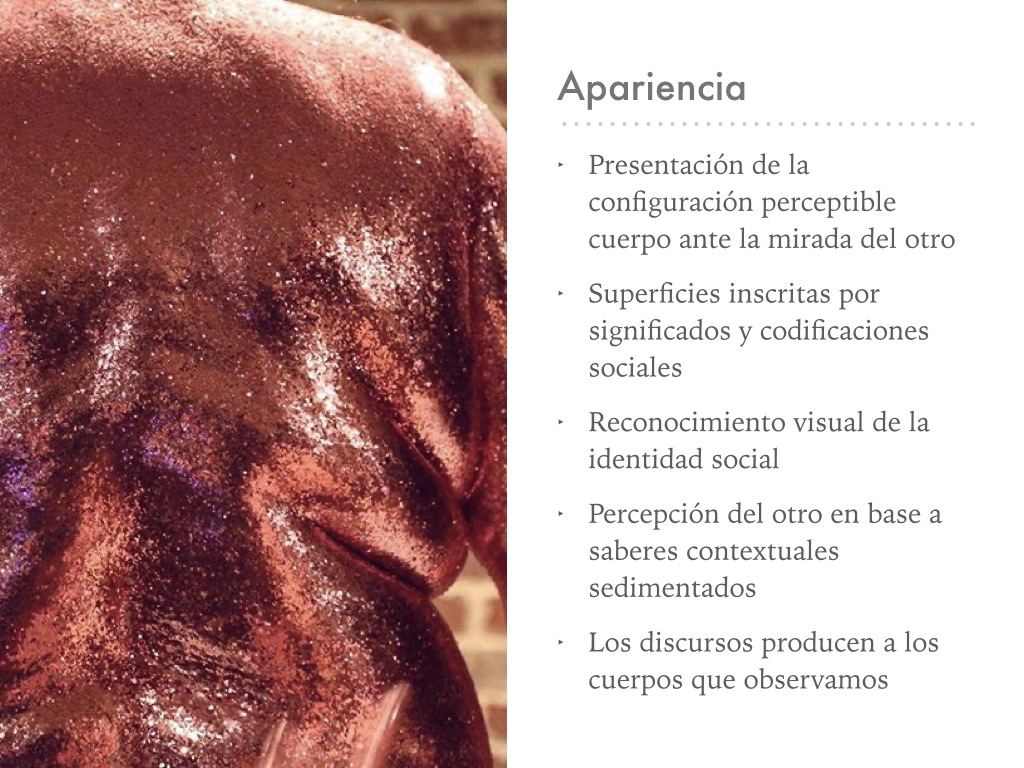 Siguiendo a Elizabeth Grosz, entendemos la apariencia como la configuración perceptible del cuerpo, como una superficie inscrita por significados y codificaciones sociales.
