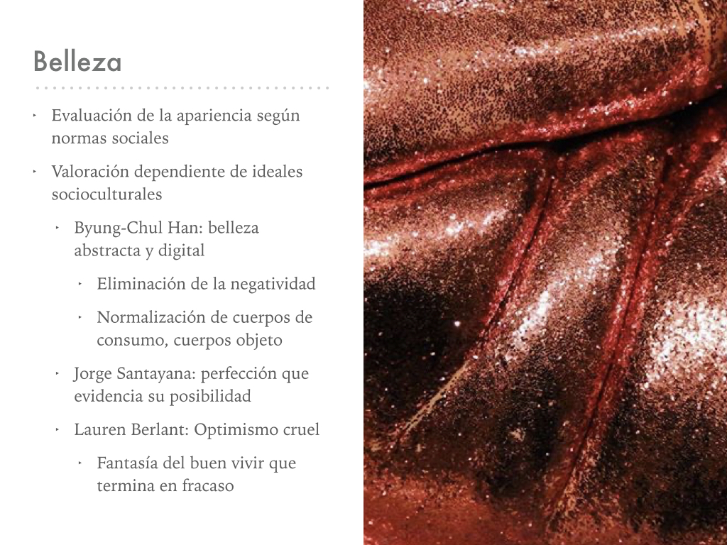 Según Byung Chul Han, el ideal en la modernidad tardocapitalista occidental se remite a los cuerpos pulcros y lisos; es decir, la búsqueda de una perfección abstracta, inclusive digital, que se ubica en antítesis contra las apariencias naturales, “descuidadas”, carentes de trabajo corporal. En este sentido, la producción de cuerpos ideales se basa en la remoción de toda negatividad, imperfección, sobra y extrañeza, para producir cuerpos-objeto que no desafíen al status quo, que sean completamente positivos, normalizados: cuerpos de consumo.