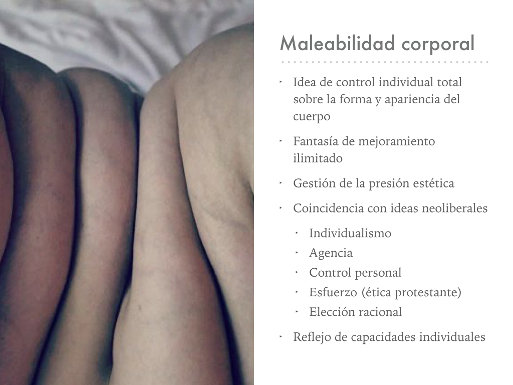 A partir de esta idea, los individuos gestionan la presión estética de adecuarse a los ideales socioculturales de belleza, a través de valores y habilidades que son neoliberales, como la fuerza de voluntad, el esfuerzo, y la elección racional de consumo.