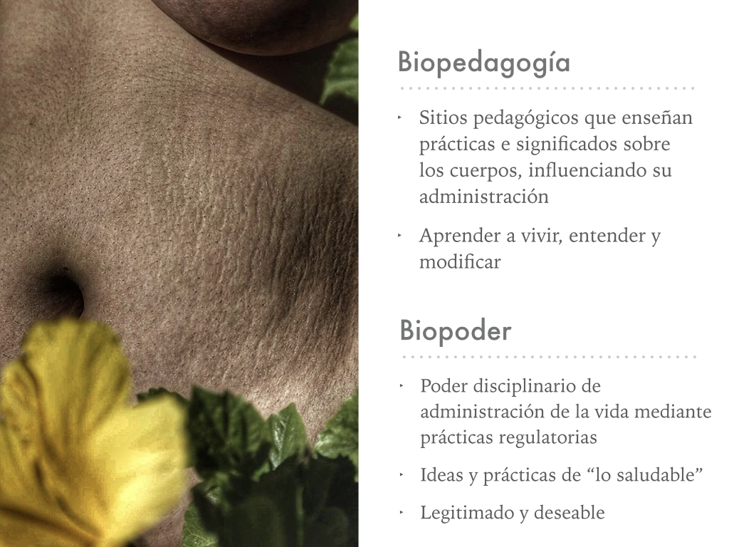 La vida diaria resulta regulada por la biomedicina desde el biopoder, que es la regulación y gobierno del cuerpo y la vida a partir de un regimen de lo deseable y lo legítimo, es decir, esta idea y prácticas de “lo saludable” que regulan nuestras vidas y que se ligan directamente con la delgadez.