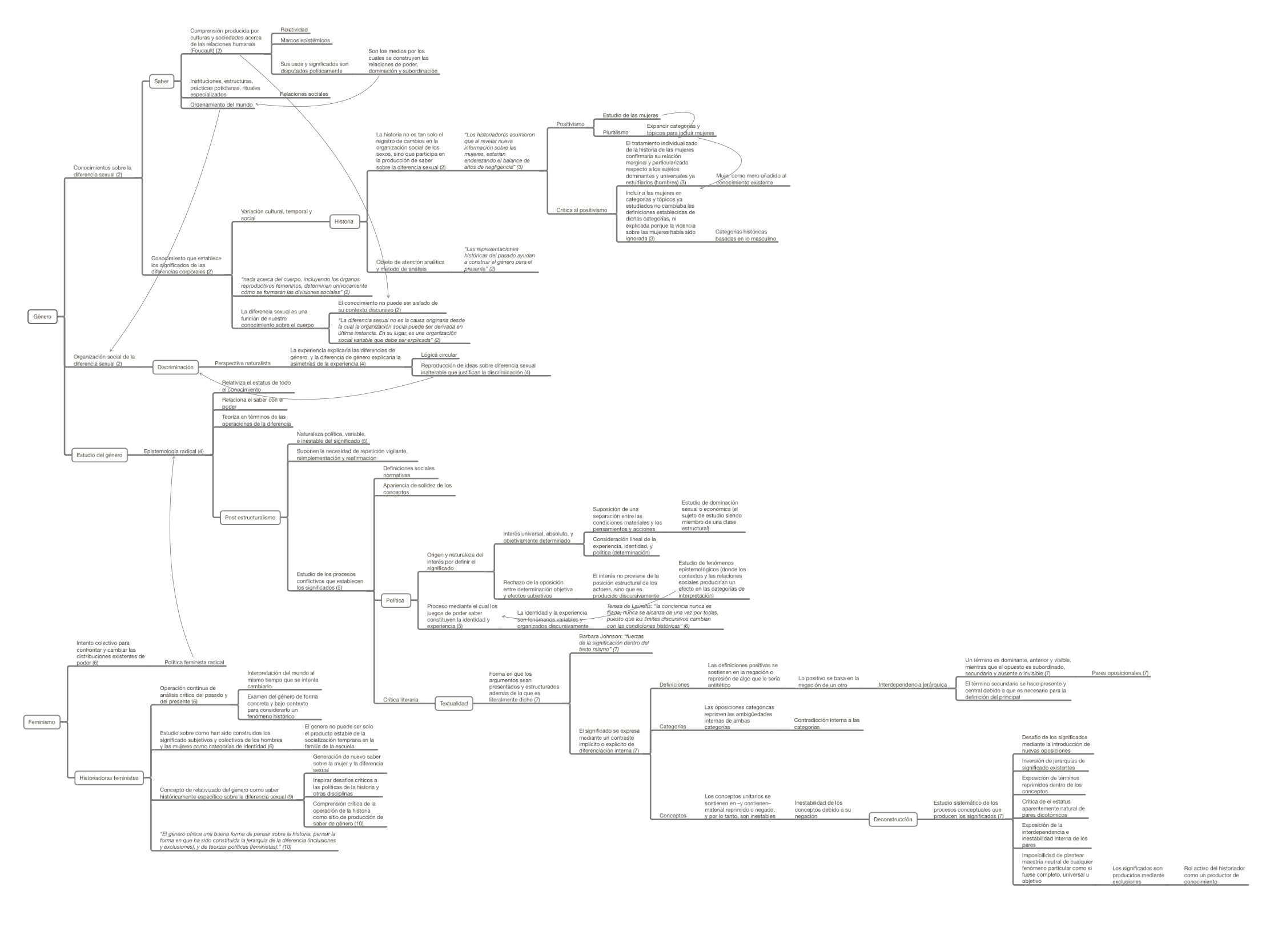 Este mapa conceptual proviene de la lectura de la introducción del libro Género y las políticas de la Historia, de Joan Wallace Scott, eminente teórica del género. Esta introducción es notable, dado que en su corta extensión ofrece certeras definiciones de conceptos como género, saber, historia y similares, una contextualización del concepto de historia y saber desde un marco teórico foucaultiano, y además, un desglose del método de análisis de la textualidad, que deriva en la deconstrucción derrideana como metodología de análisis del género desde una perspectiva histórica.