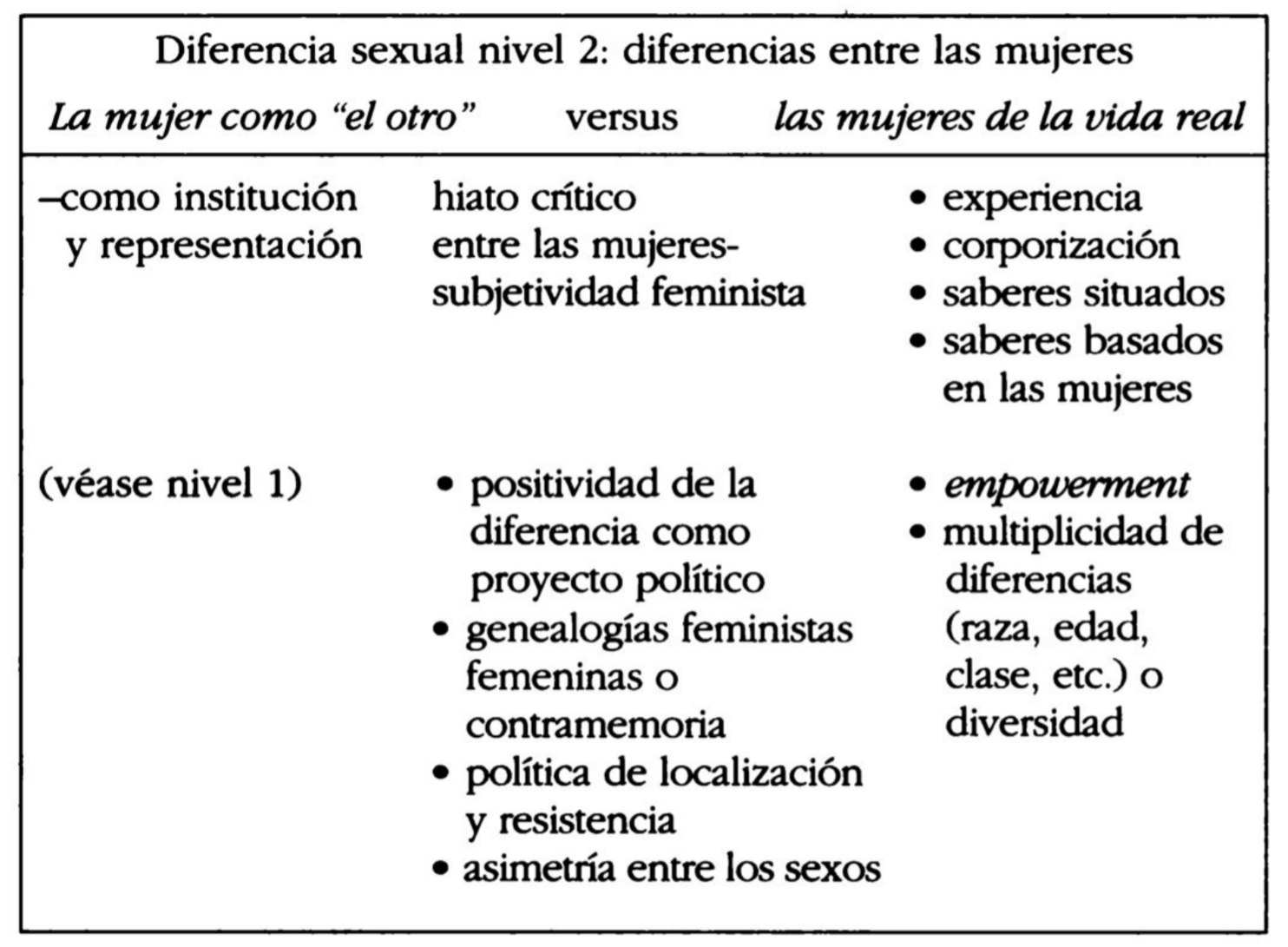 Lo feminista consiste tanto en impulsar la inserción de las mujeres en la historia patriarcal (el momento emancipatorio o la diferencia sexual, nivel 1) como en cuestionar la identidad personal sobre la base de las relaciones de poder, lo cual constituye el feminismo de la diferencia (la diferencia sexual, nivel 2). 192