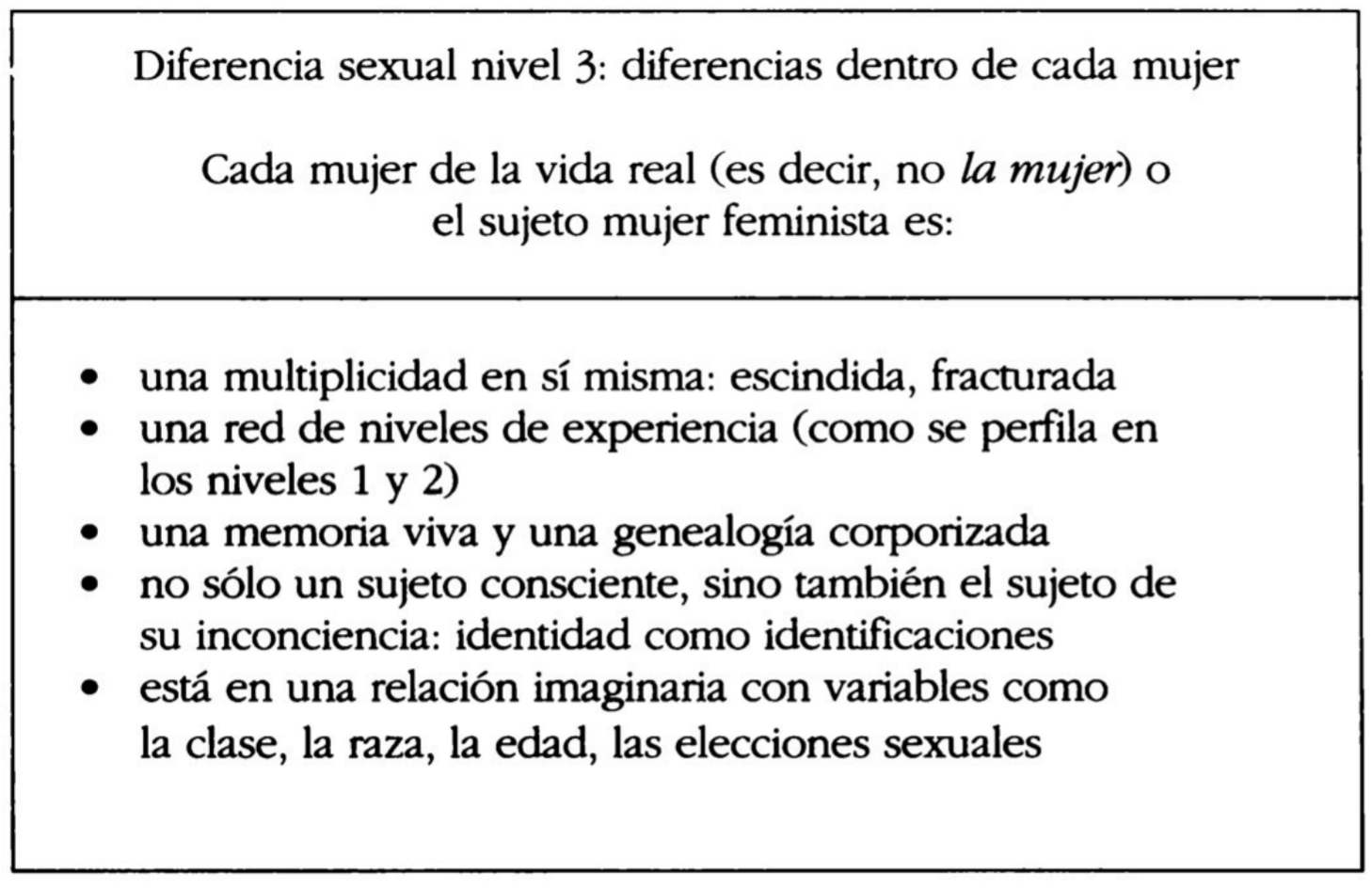 Partiendo de la premisa de que el sujeto mujer feminista es uno de los términos de un proceso que no debería ni puede ser reducido a una forma lineal, teleológica de subjetividad; partiendo de la premisa de que debería entenderse como la intersección del deseo subjetivo con la transformación social deliberada, deseo avanzar un paso más y sostener que la diferencia sexual permite afirmar formas alternativas de subjetividad política feminista: las feministas son las mujeres post-la mujer. 200-201